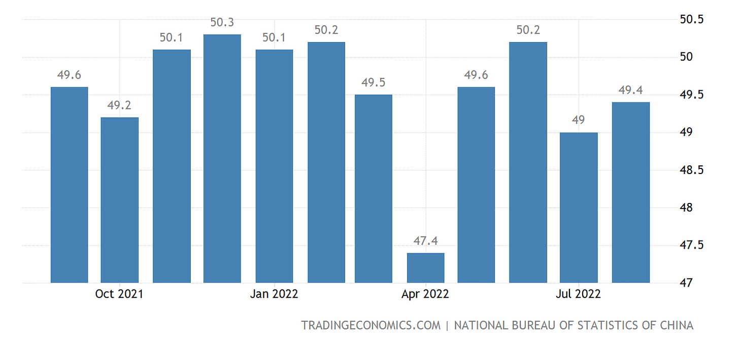 The official purchasing managers’ index for China's manufacturing sector crawled up to 49.4 in August from July's reading of 49, the National Bureau of Statistics said on Aug 31.