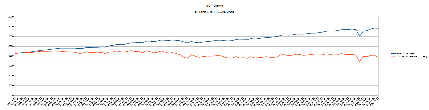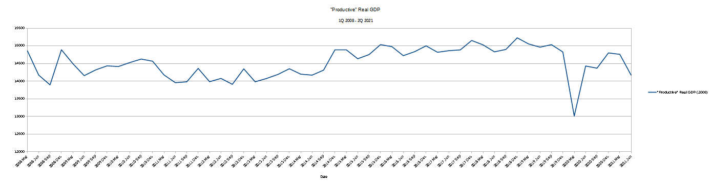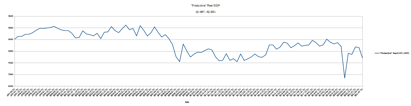 Viewed in this way, regardless of which base period we select, we see economic output (“Productive” Real GDP”) either unchanging or declining.