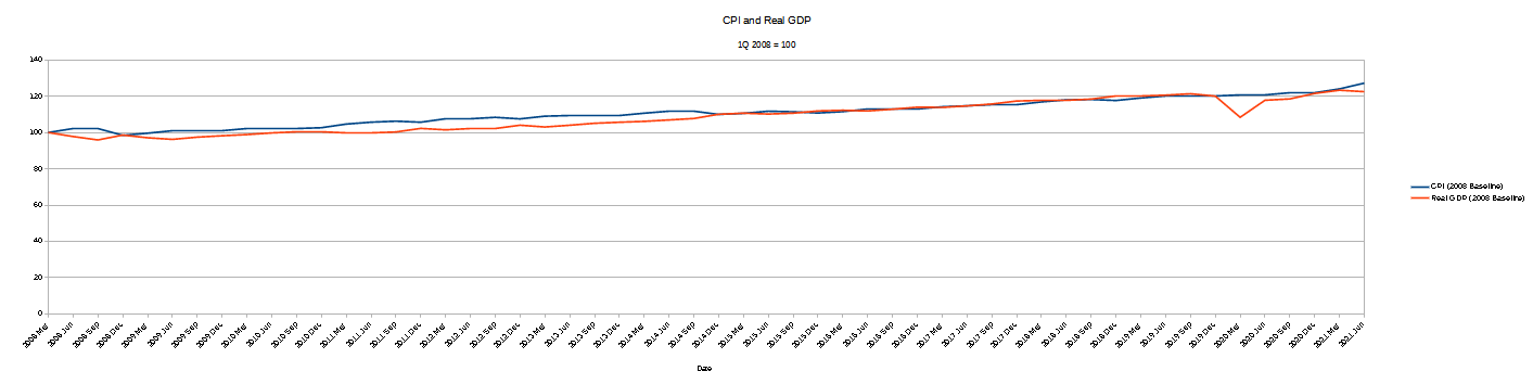 Because CPI and GDP are disparate measurements, the CPI being a straightforward index and GDP being the dollar-denominated gauge of economic output, in order to unify the presentations I focus on the overall trends and relative shifts in those trends. This is done by setting a baseline of 100 as the start of the data set, and then dividing each subsequent value in each data set by the starting value; multiplying that result by 100 gives for each data set an output of values that can be compared side by side for correlations as to the general trend and the relative magnitudes of changes.