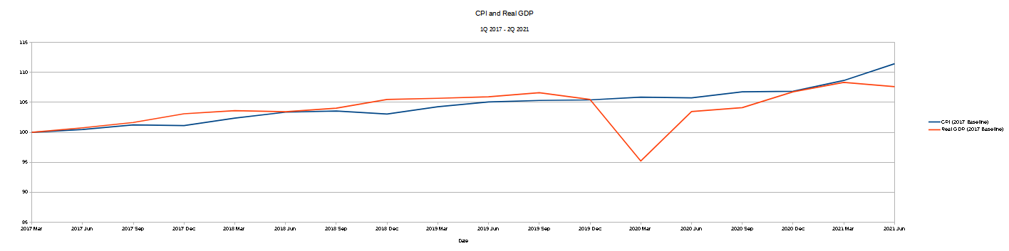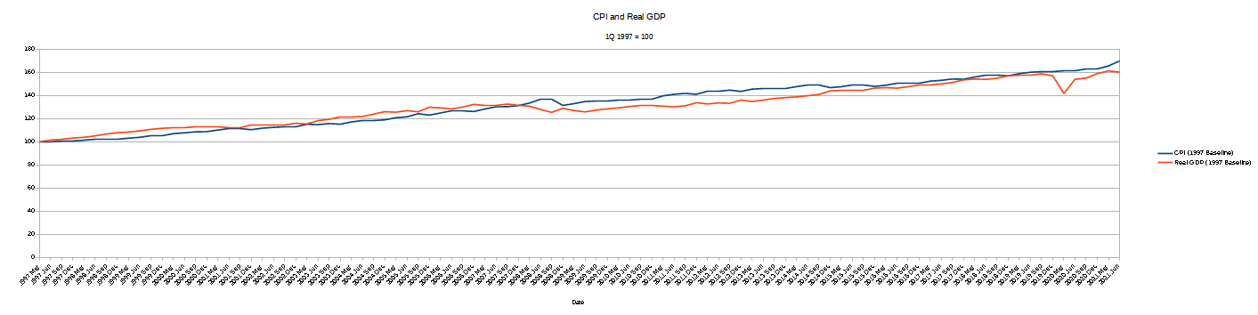 The two data sets I use here are the St. Louis Federal Reserve’s quarterly measurements of Gross Domestic Product (GDP), Seasonally Adjusted and the Consumer Price Index (CPI) as measured by the Bureau of Labor Statistics, both freely available online. As the CPI figures are given monthly, I take the figures for March, June, September, and December of each year in order to align the data with the quarterly GDP numbers, those being the ending months of each calendar quarter. I am working with data in both sets going back to 1997, and ending with the second quarter of 2021.