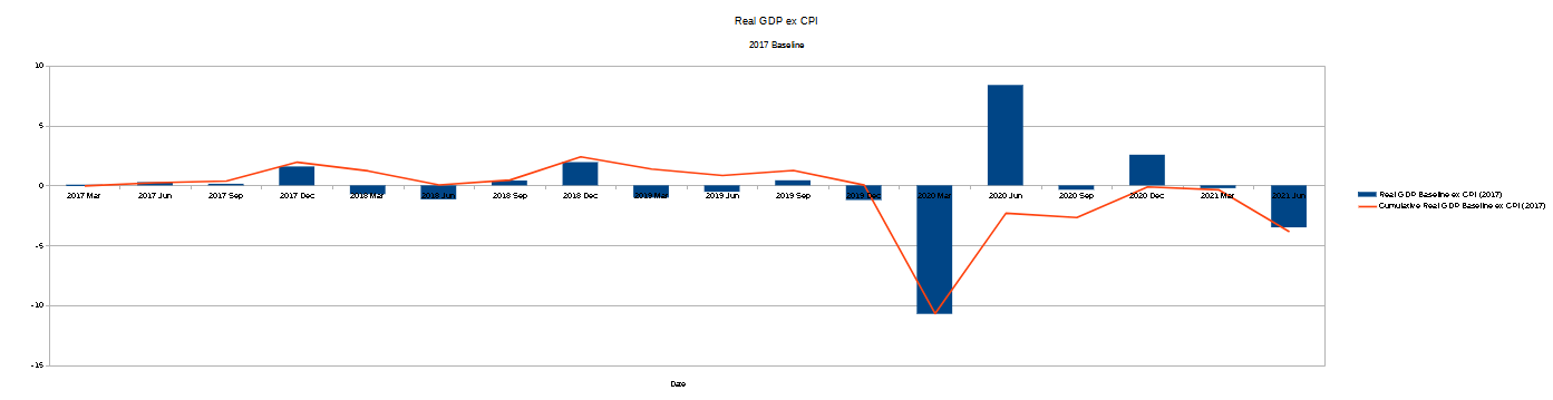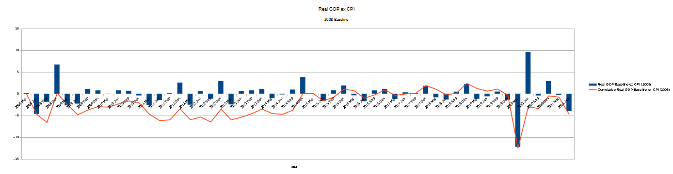 If we reverse the baseline calculation above, but use the Real GDP ex CPI values, we can see clearly how distorting inflation is on GDP measurement, and how it gets worse over time.