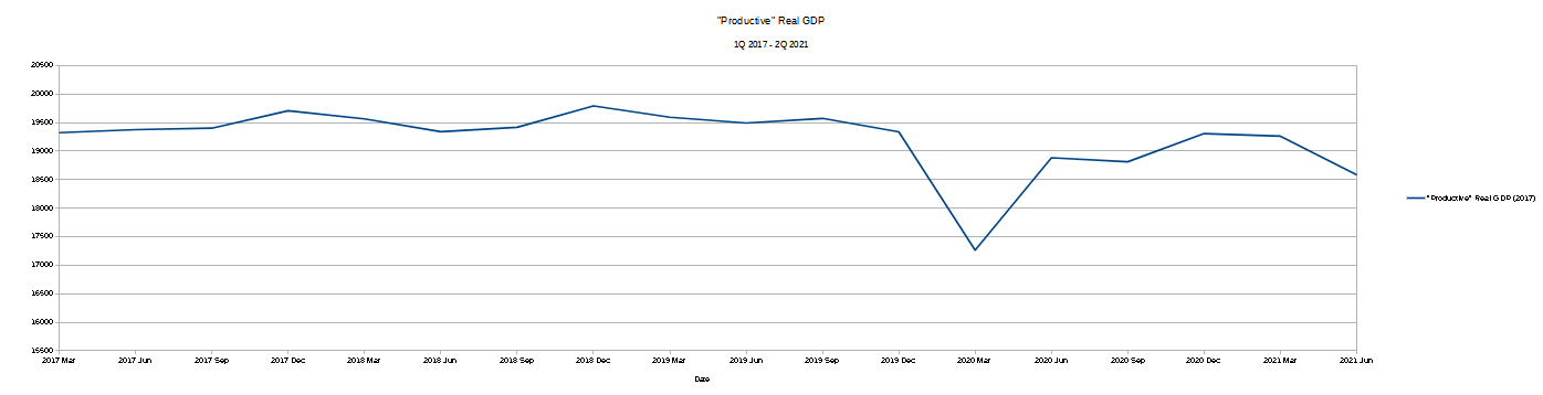 The lockdowns resulted in a dramatic drop in productive economic output from which a full recovery has not occurred. As of the end of the analysis, the second quarter of this year (2021), the decline in productive economic output suggests full recovery from the 2020 lockdowns will be some time to come still.