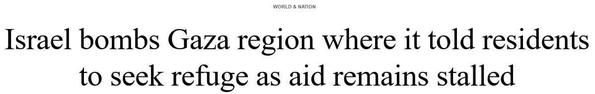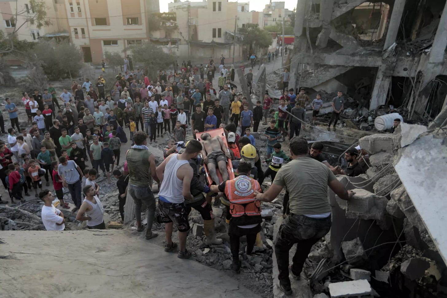 The caption for the image reads: “ Residents evacuate a survivor Tuesday from a house destroyed by an Israeli airstrike in the southern Gaza Strip town of Khan Younis.”