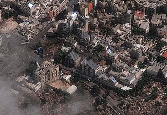 The closest we get to an image that could be an image from Al Ahli Hospital is an almost generic image of a blast within a dense urban area.