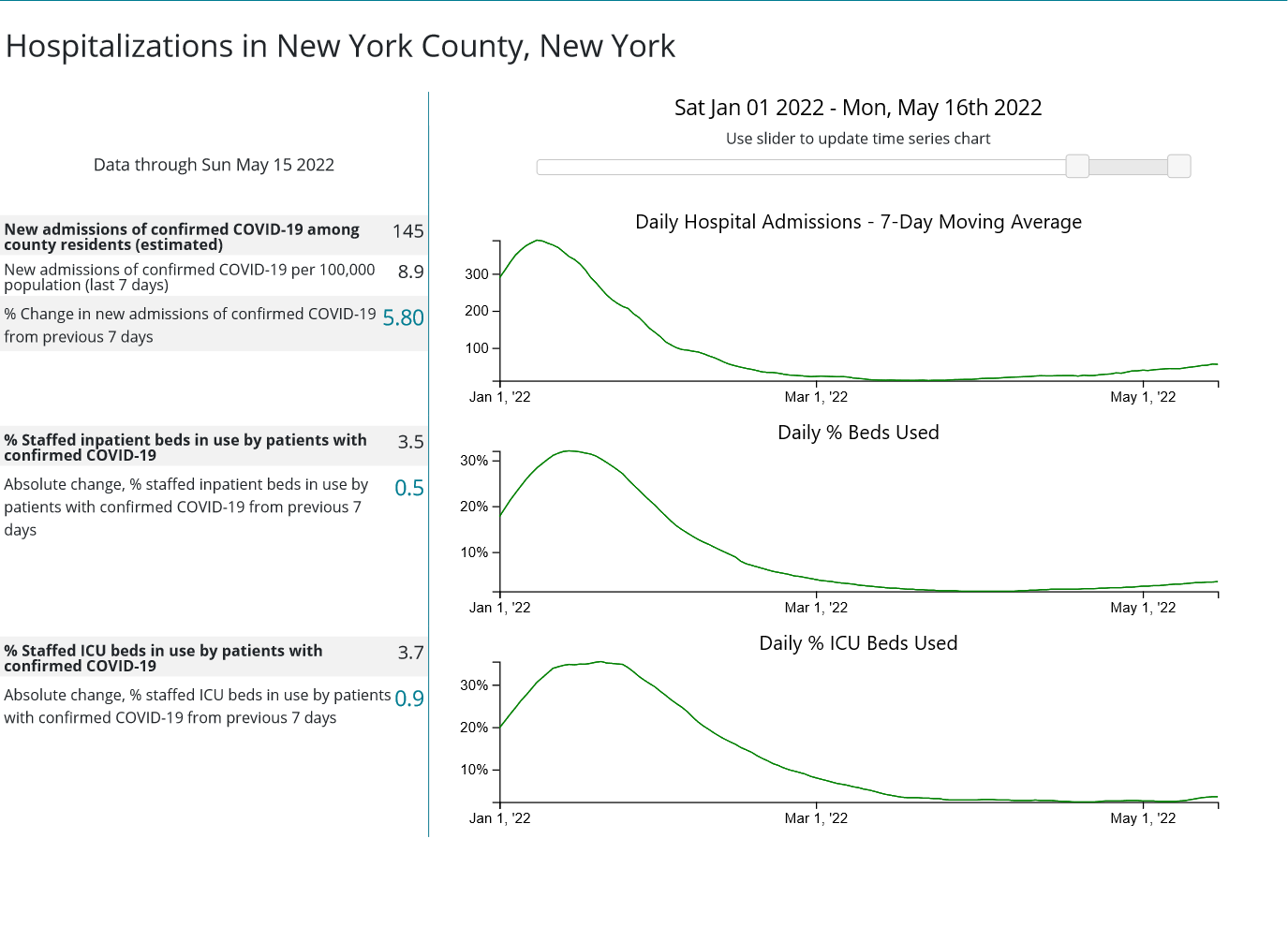 Similar data is almost always published by one’s state and/or local public health agency as well. A quick DuckDuckGo search of COVID-19 data for your area should suffice for finding the relevant data. Rising cases and/or hospitalizations indicate a greater prevalence of disease—and thus greater risk of exposure.