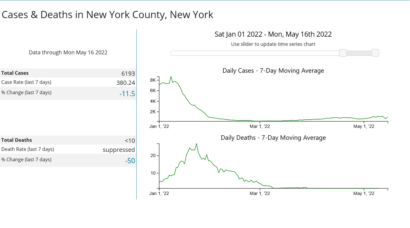 Added to the known risk factors and mitigations is the known level of COVID-19 in a particular area. The CDC provides county-specific monitoring of COVID-19 cases and deaths (New York County, New York, for example).