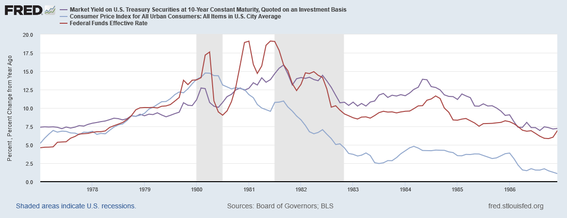 Note again that the peak came after former Fed Chair Paul Volcker began hiking the Federal Funds Rate hoping to choke off inflation with high interest rates.