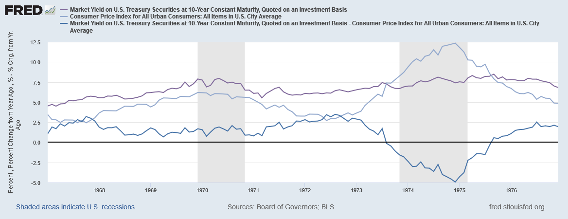 Going back to the 1974 recession, when inflation surged above the nominal yield for the 10 Year Treasury, the same pattern plays out. Starting with inflation’s low point in June of 1972, when inflation stood at 2.7%, the nominal yield on the 10 Year Treasury was 6.15%. Inflation would peak in December of 1974 at 12.34%, but the nominal yield actually peaked 4 months earlier at 8.11%.