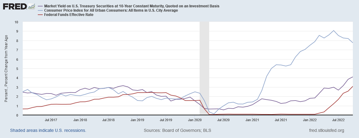 From June to October, the Federal Funds rate rose to 3.08% while 10 Year Treasuries rose to 4.1%. That’s a 1.87% (187bps) rise in the Federal Funds rate to achieve a 1.12% (112bps) rise in Treasury yields. A larger rise in the Federal Funds rate is accompanying a smaller rise in interest rates.