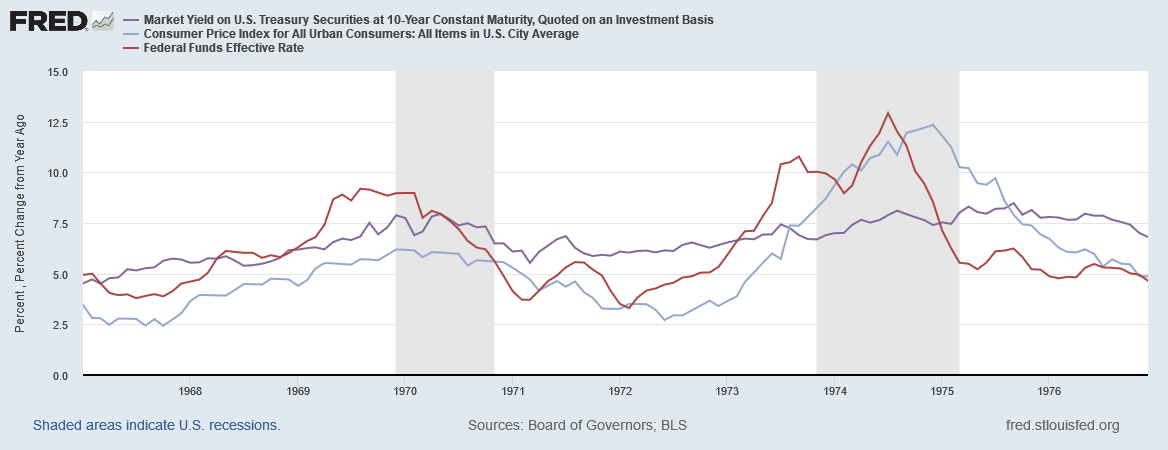 That is a relative increase in the Federal Funds rate of 67.1%, and an absolute increase of 7.67%. During that period, nominal yields actually came close to matching the Federal Funds rate in terms of a relative increase, at 67.8%, but with an absolute increase of 6.4%.